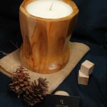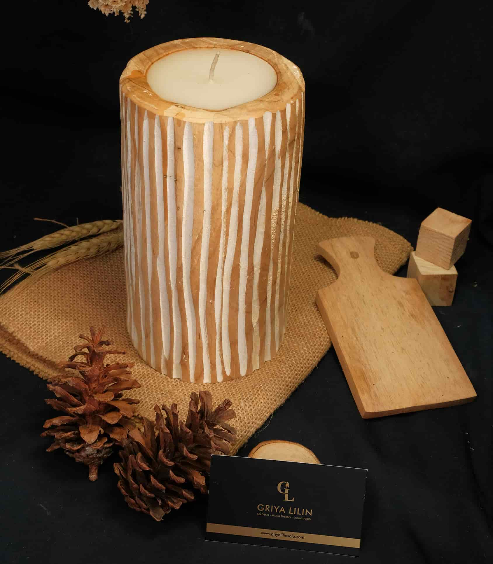Lilin berbentuk tiang dengan wadah kayu dan vertikal garis-garis.
